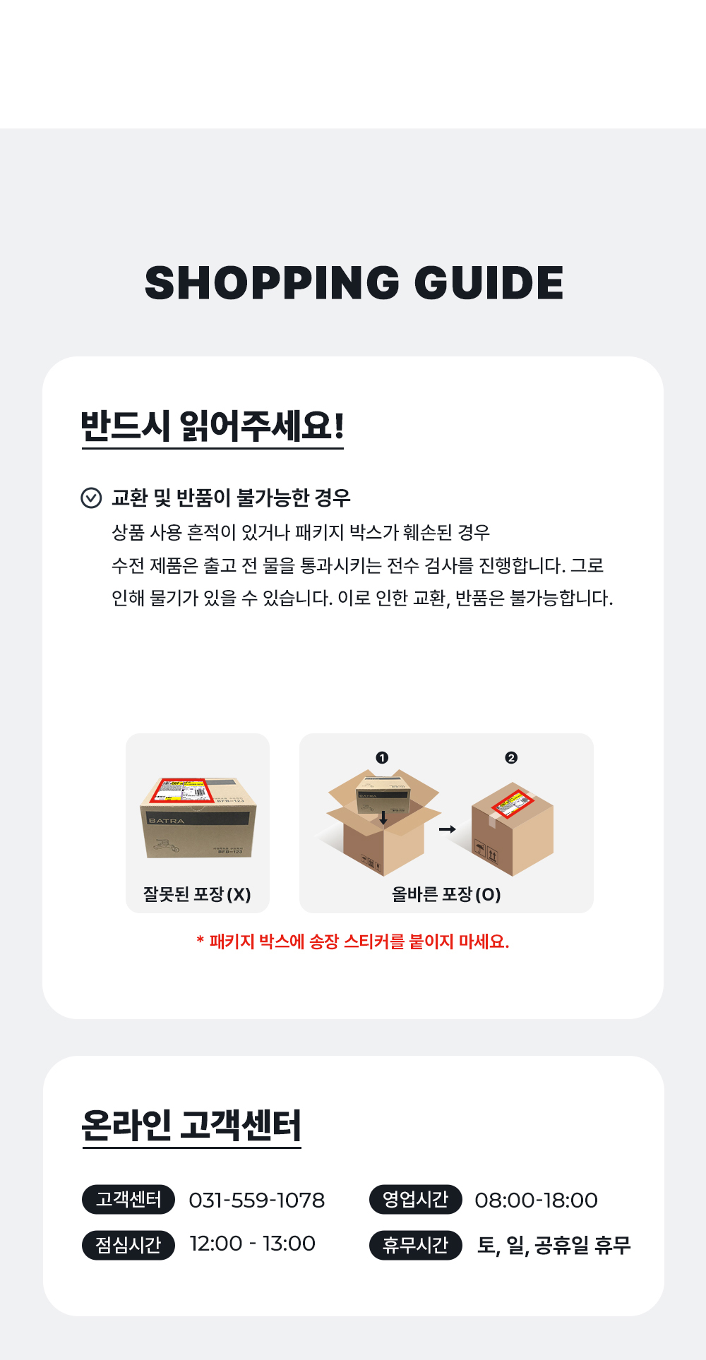 - 제품 가치가 훼손된 경우, 패키지 박스 분실 및 훼손의 경우 제품 수령일 7일 이내여도 교환 및 반품이 불가능합니다. 반드시 배송 된 그대로 포장해서 보내주시기 바랍니다.